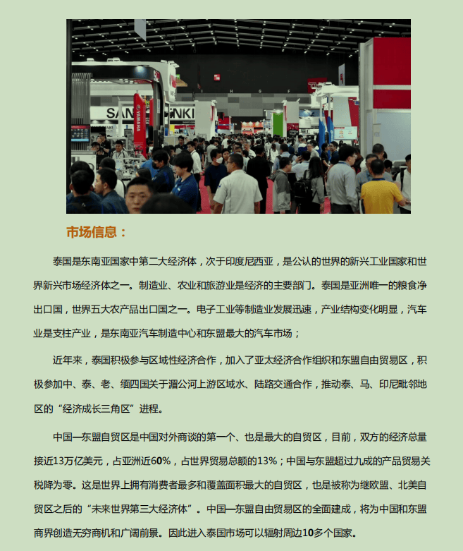 正在全球工业兴旺成长的海潮中,2025 年泰国工业展即将于2025年6月18-21日 正在泰国曼谷国际商业展览核心 BITEC 昌大。做为东南亚地域极具影响力的工业嘉会,此次展会承载着鞭策区域工业前进、推进国际交换合做的主要,吸引着全球工业范畴的目光。泰国,做为东南亚的经济沉镇,地舆得天独厚,处于毗连亚洲的交通枢纽焦点,具有便利的航空、公和铁收集,为工业成长供给了天然的物流劣势。近年来,泰国制制业飞速成长,财产布局持续优化,汽车业已成为支柱财产,是东南亚汽车制制核心和东盟最大的汽车市场。同时,电子工业等制制业也兴旺兴起,为泰国工业展奠基了的财产根本 。潘186同2175微7420跟着全球工业朝着智能化、绿色化、数字化标的目的迈进,泰国积极潮水,出台一系列的经济政策,吸引外资,推进商业,并深度参取亚太经济合做组织和东盟商业区等区域经济合做,为工业展创制了广漠的市场机缘和合做空间。