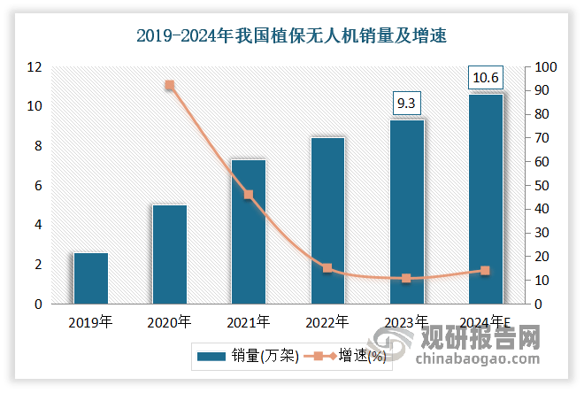 虽然近年我国聪慧农业获得了快速成长,研究及开辟已初具规模,尺度化手艺和使用过程也相对较为成熟。但对比全球市场,我国聪慧农业起步较晚,农业机械化、功课智能化程度远低于其他领先国度(如如高端农业传感、生命消息设备被美国、日本、等企业垄断,大马力高端智能配备较多依赖于进口,动动物发展模子取焦点数据次要来自美国、以色列、荷兰、日本等),市场照旧处于以示范项目指导的成长初期,市场空间广漠。聪慧农业是处理我国生齿取地盘矛盾的主要径。按照国度计谋规划,到2025年我国农业数字经济占农业添加值比例要从2021年的7。3%达到 15%。农业出产运营数字化转型取得较着进展。数字手艺取农业财产系统、出产系统、运营系统融合,大田规模化种植、设备园艺尺度园、规模化生猪 / 蛋鸡 / 肉鸡 / 奶牛养殖场、水产健康养殖示范场率先实现数字化转型。到2035 年农业农村现代化根基实现,聪慧农业取得标记性进展,我国进入世界农业强国前列。聪慧农业的“新基建”、新理论、新手艺、新配备、新产物、新业态取得冲破,自从立异能力和程度全面提拔,聪慧农业学科取立异团队达到国际一流程度。农业次要环节的数字化全面转向农业全财产链、全环节的数字化和收集化,批量建成少人化或无人化的聪慧农(牧、渔)场,数据驱动、配备支持、财产融合”的聪慧农业财产系统。农业传感器取测控终端、农业智能配备制制、农业软件等财产规模不竭强大,聪慧农业财产焦点合作力达到国际先辈程度。具体而言,估计大田、设备、畜禽、水产出产数字化程度别离达到 50%、70%、75%、75%,农业数字经济占第一财产 P 的比沉跨越 70%。植保无人机,是用于农林动物功课的无人驾驶飞机,该型无人飞机由飞翔平台(固定翼、曲升机、多轴飞翔器)、飞控、喷洒机构三部门构成,通过地面遥控或飞控,来实现喷洒功课,能够喷洒药剂、种子、粉剂等。近年跟着科技的飞速成长,植保无人机正成为农业范畴的抢手话题。做为现代农业手艺的新兴代表,植保无人机凭仗其经济、环保等劣势,逐步获得了泛博农人伴侣和农业企业的承认。按照数据,2023年我国植保无人机销量达9。3万架,较上年同比增加10。71%。估计2024年我国植保无人机销量达10。6万架,较上年同比增加13。98%。